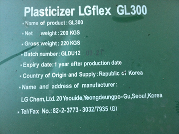 • 型號/類別: LGflex TINTM增塑劑 UN399 電阻率:5.0 MIN.  沸點°C:311℃  傾點°C:-33℃  推薦應用:電纜、膠皮膠布、手套、 鞋子、建材、PVC可塑糊等
